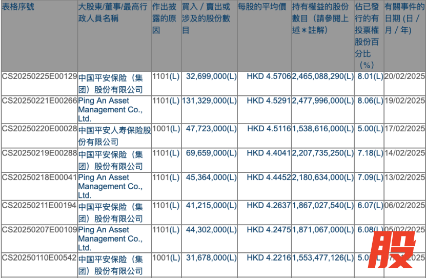 根据港交所披露数据,平安人寿在2月17日买入4772.3万股农业银行H股,每股均价为4.5116港元,耗资2.15亿元,交易后持股比例5%。